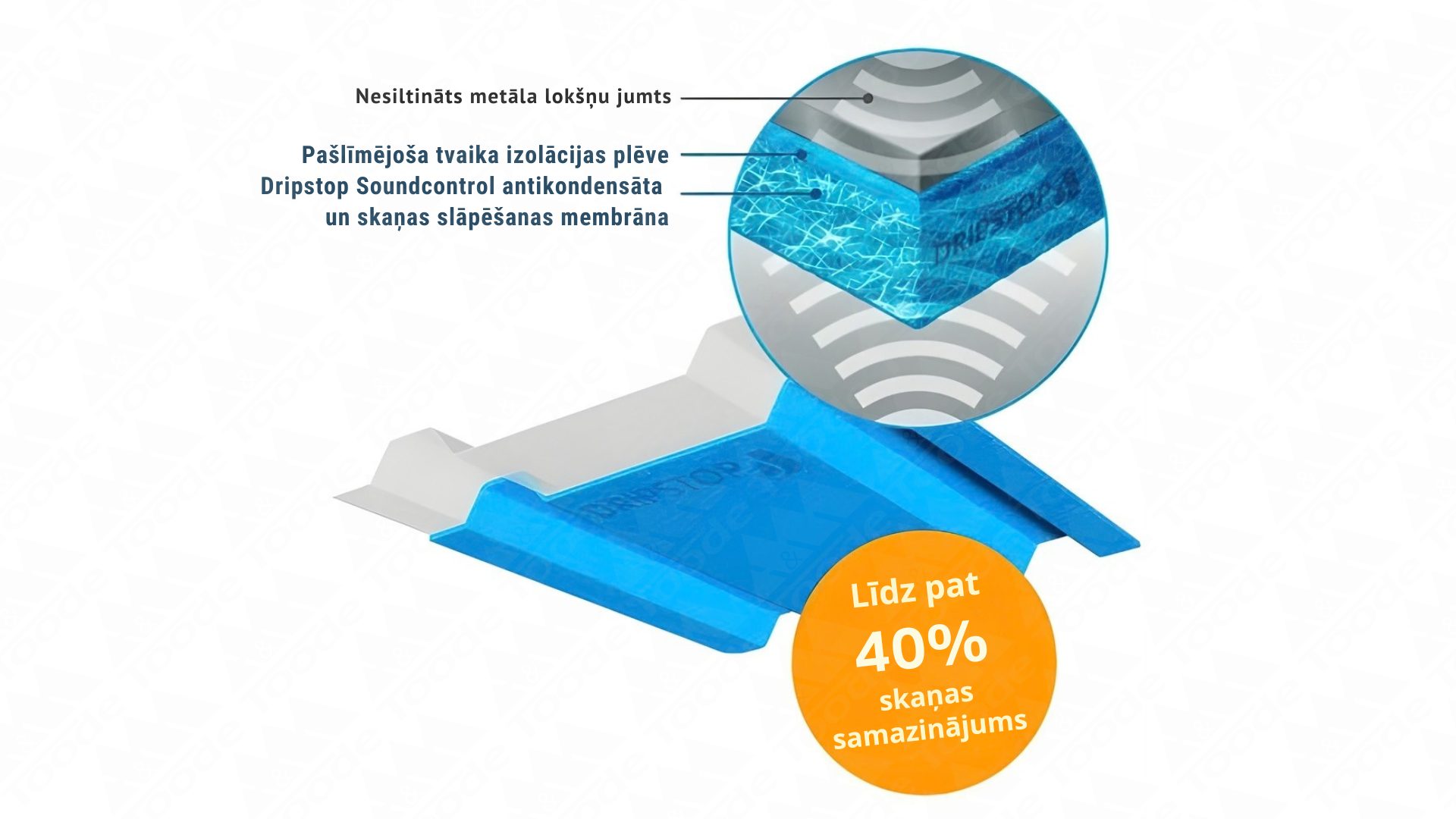 Tas ļauj samazināt trokšņa līmeni telpās zem jumta par aptuveni 35–40%, nodrošinot vēl augstāku akustisko komfortu salīdzinājumā ar standarta risinājumiem.