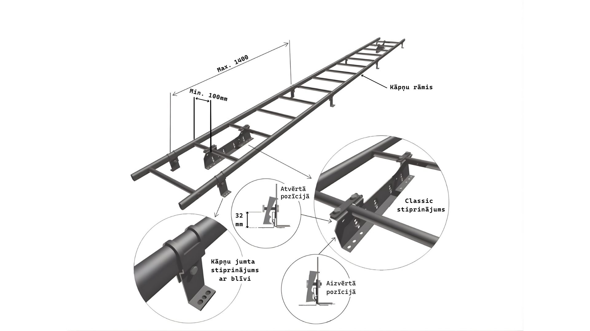 Kāpņu stiprinājumi jāuzstāda virs jumta latojuma vai citas nesošās konstrukcijas. Attālums starp stiprinājumiem nedrīkst pārsniegt 1400 mm.