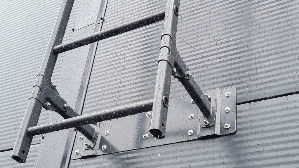 Kāpņu sistēma sastāv no vairākiem elementiem – kāpņu rāmja, stiprinājumiem, savienojumiem un drošības detaļām, kas kopā nodrošina stabilu un drošu piekļuvi jumtam.
