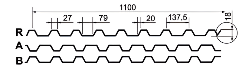TP 20 – R profila veidu izmanto jumtam, A un B variantu izmanto sienām.